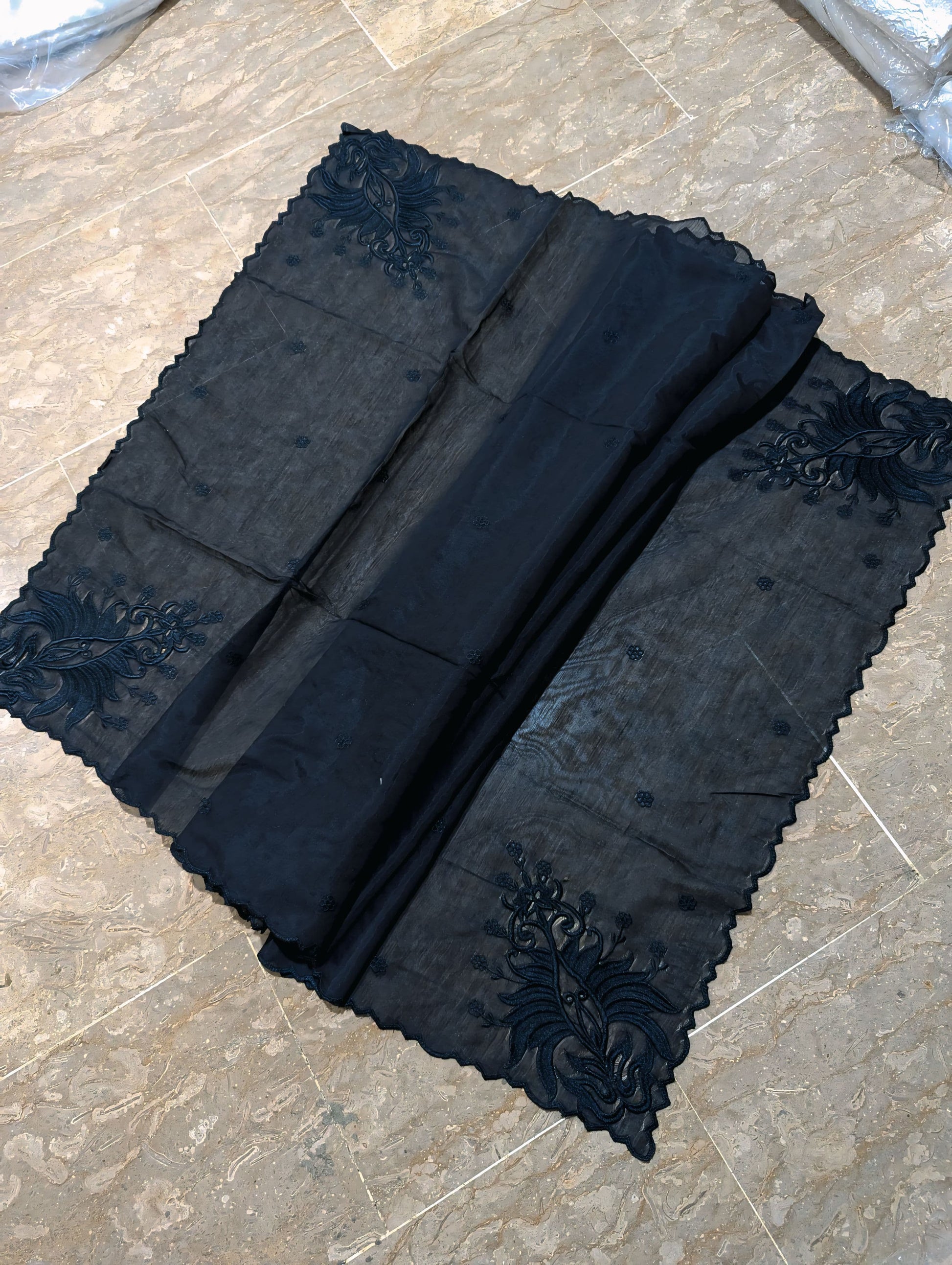 Black Voile Lawn 4-Sided Scallop Dupatta with Black Polyester Embroidery